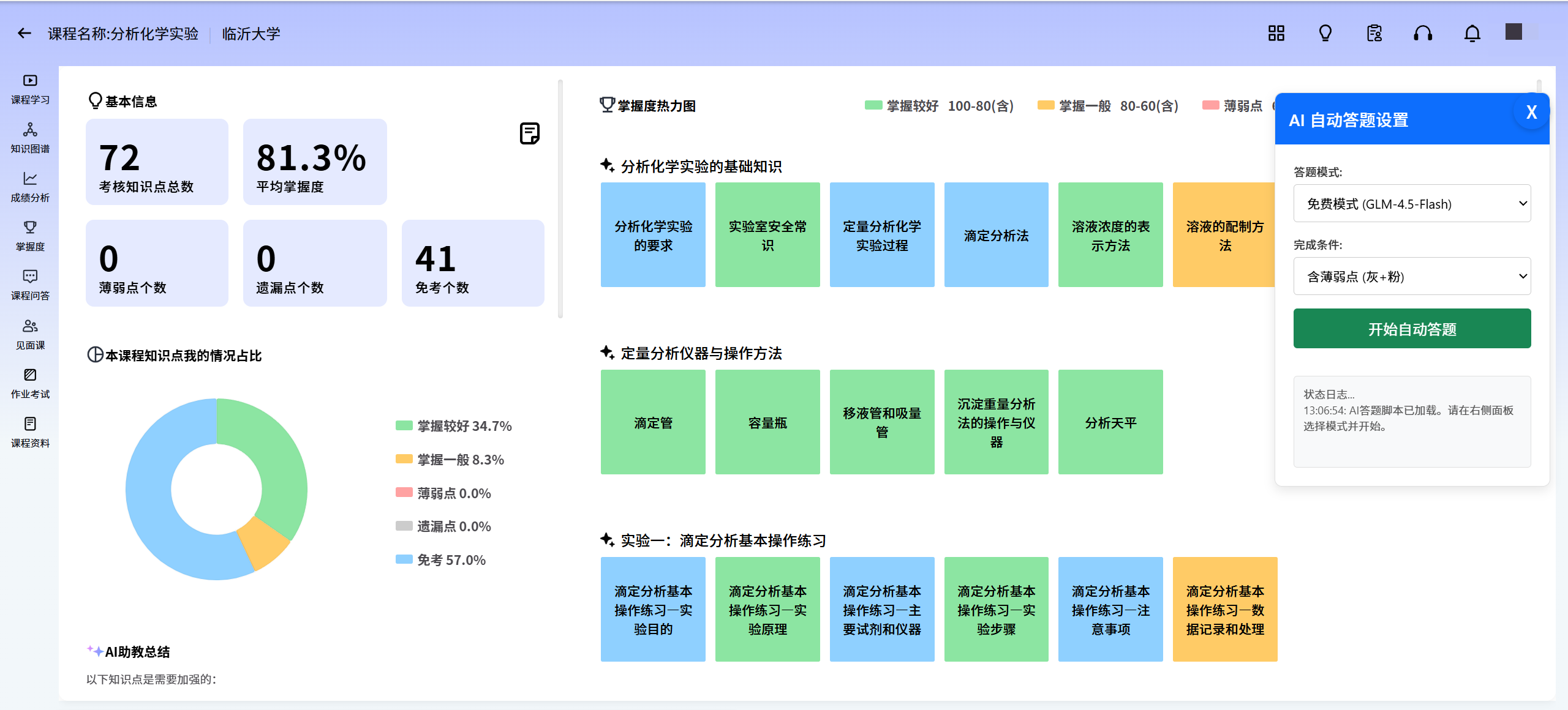 - 自动寻找任务:在课程的“知识点掌握”页面,自动定位所有未完成的灰色知识点并进入答题(或红色薄弱点,取决于用户选择,默认仅灰色未完成)。