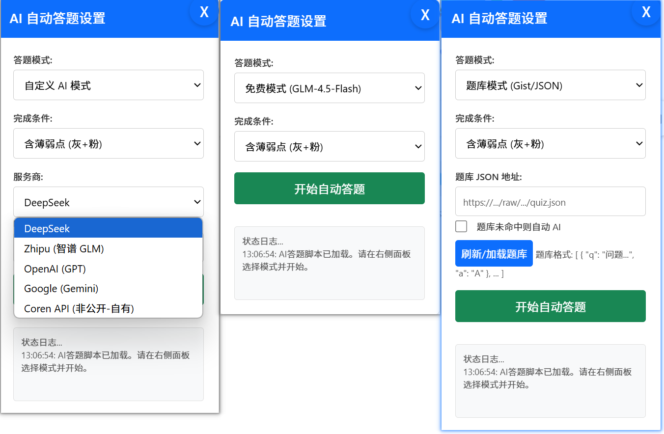 脚本只会搜索你的题库。如果没有找到答案,脚本会直接跳过这道题(在日志中显示“未找到答案”),不会去调用 AI。效果:完全依赖你的题库,适用于题库非常全、或者你不想使用任何 AI 的情况。配置完成后,点击“开始自动答题”,脚本就会按照你的设置运行了。