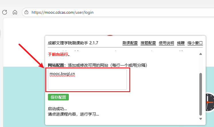 6. 添加网站,先进入任一支持的平台(如 成都文理学院在线学堂)然后在脚本界面的网站配置中输入自己学校的网址。