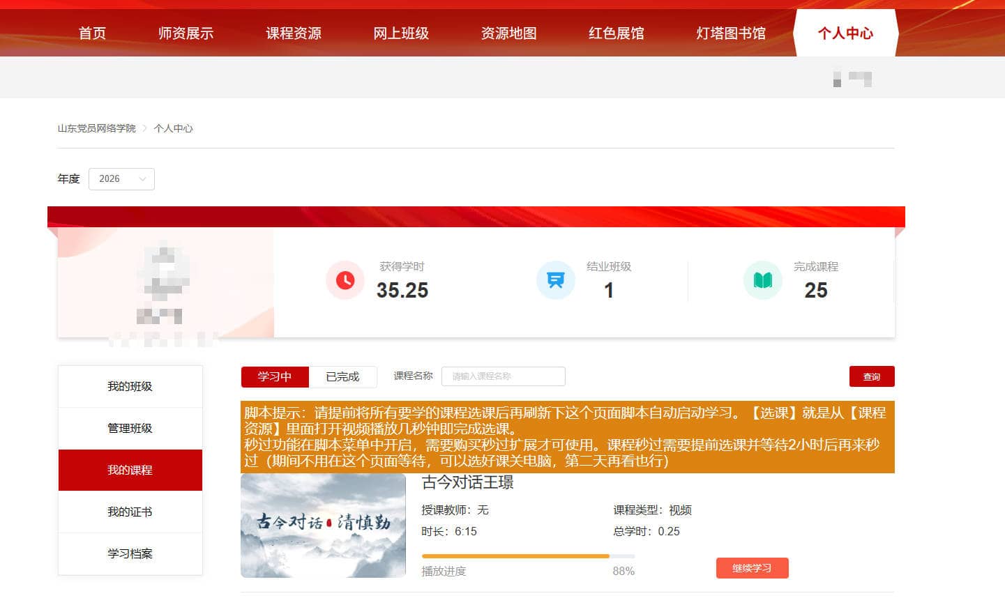 🌱【免费版】灯塔-山东党员网络学院|如需自动下一集、自动换课程、秒过等高级功能见收费版本:https://doc.zhanyc.cn/pages/dt-sdgbwlxy/